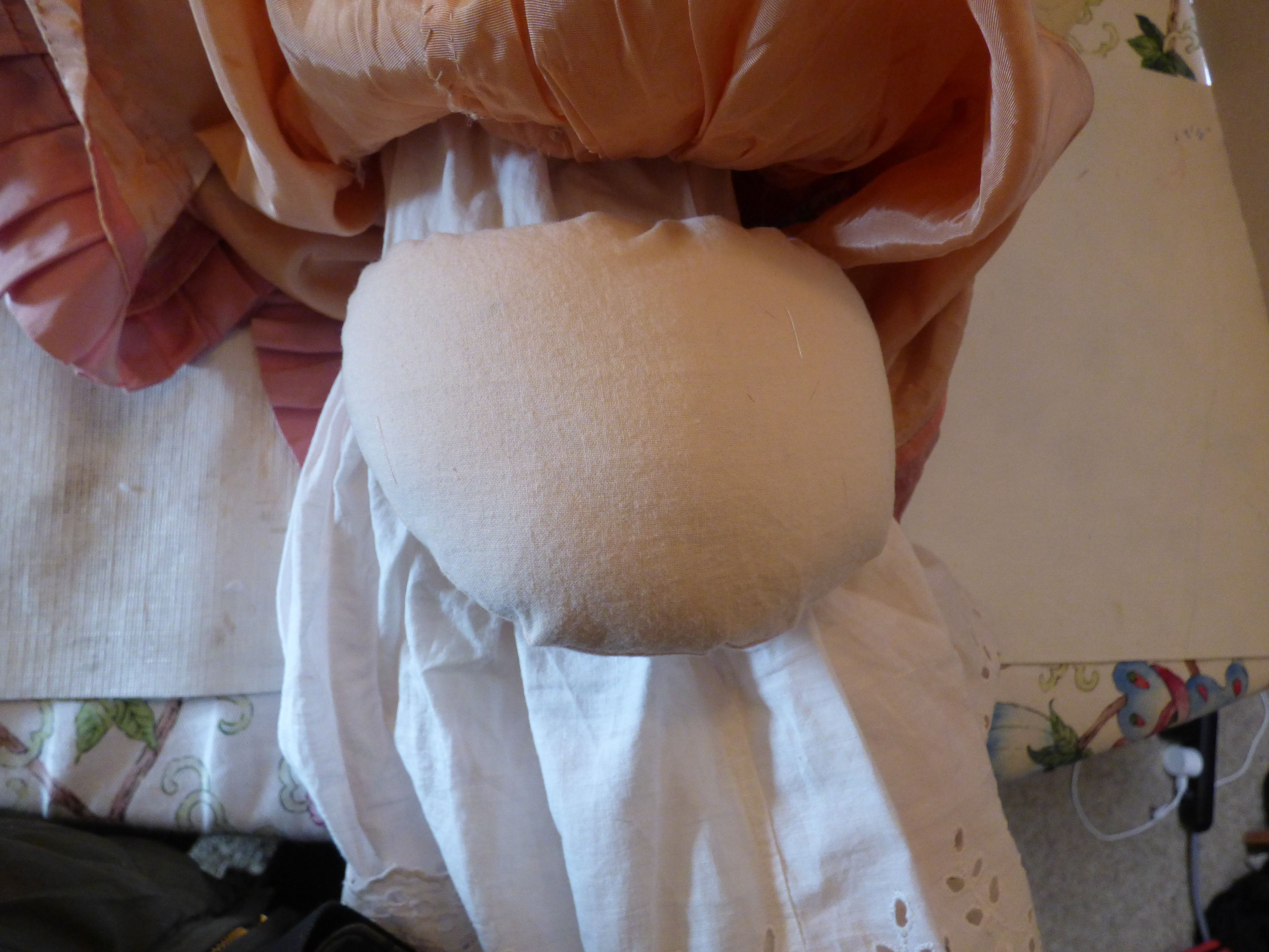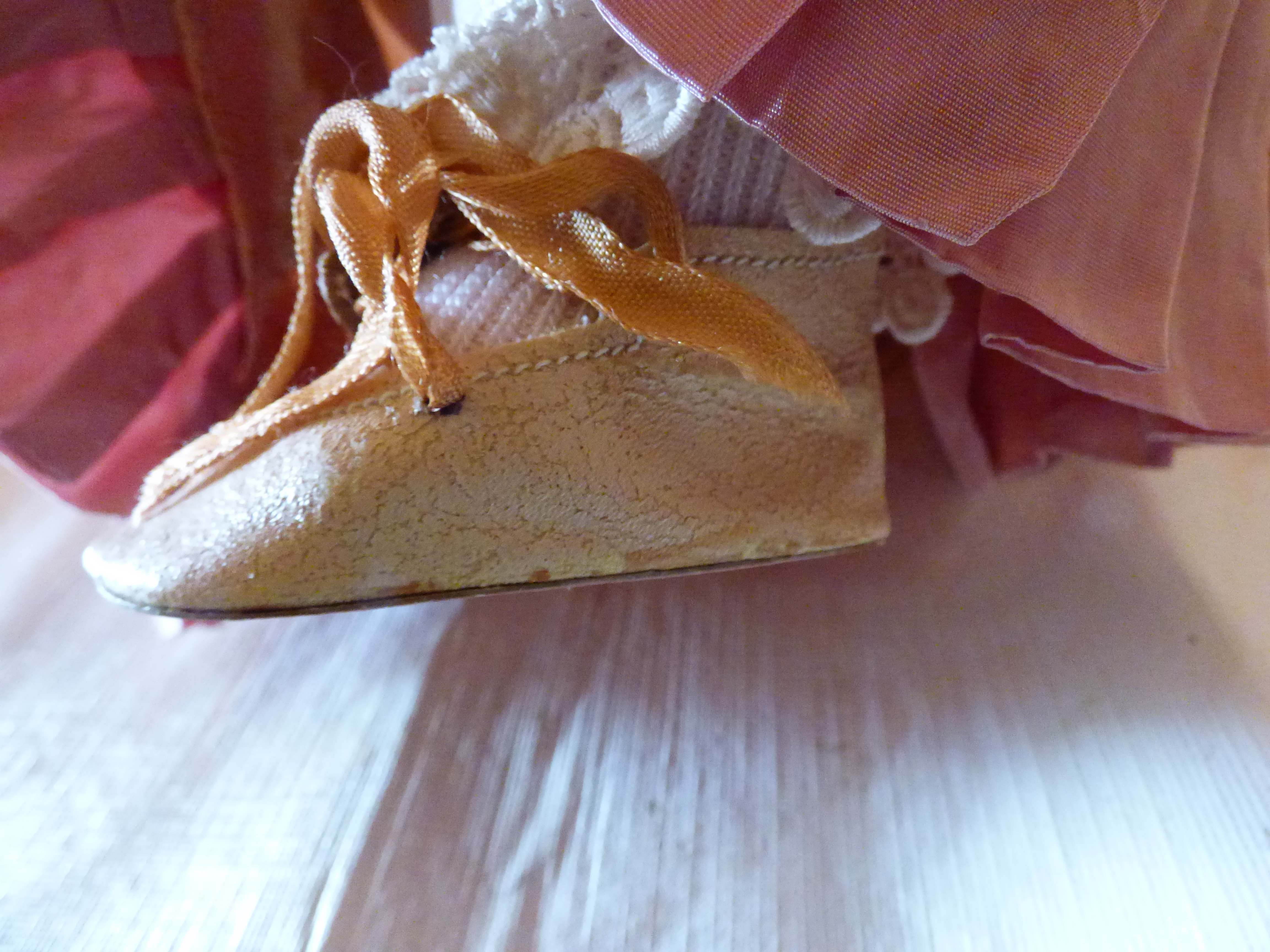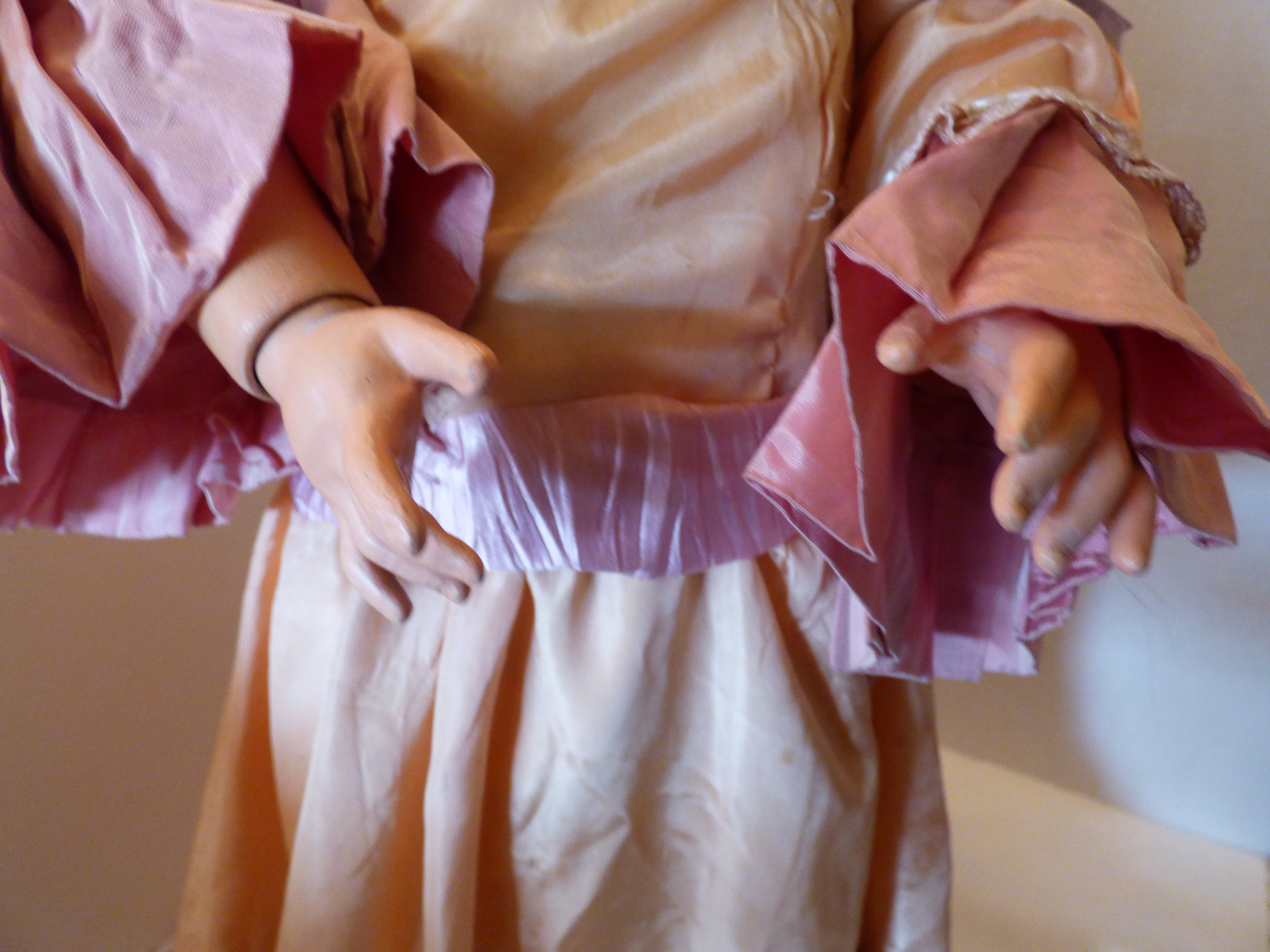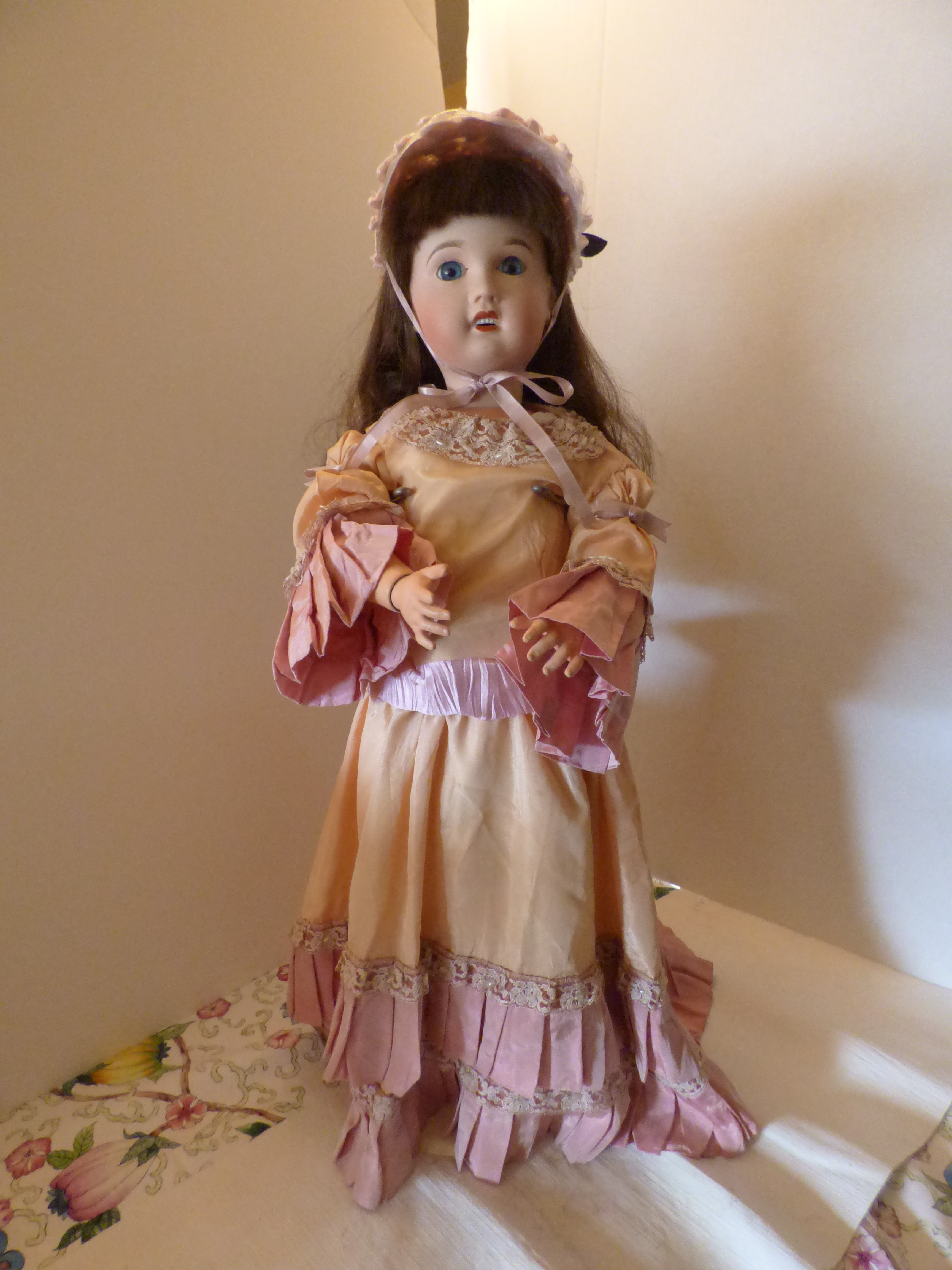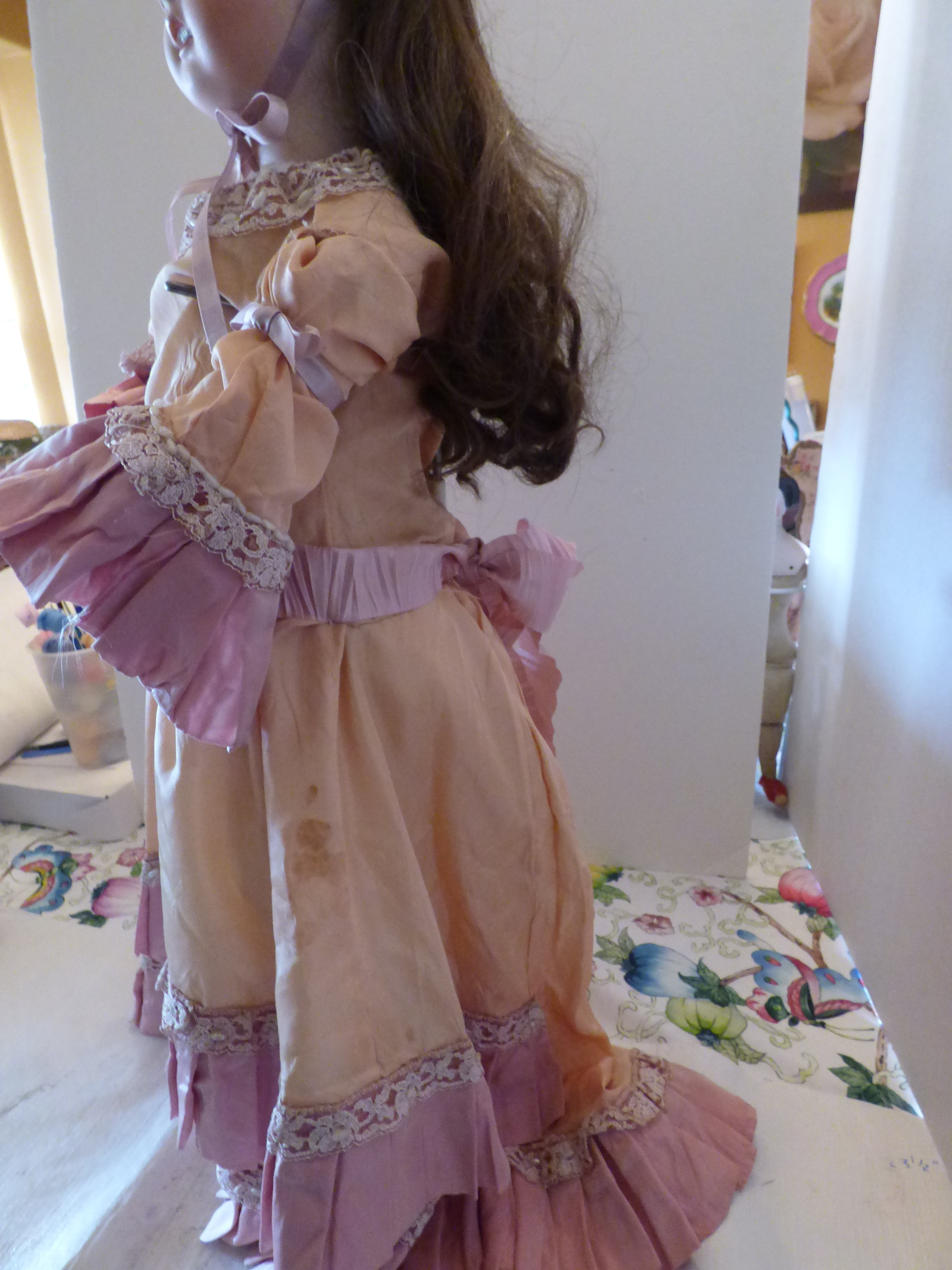 Beautiful high coloring and smile. A VERY pretty Lanternier face. She is wearing a gorgeous mauve and pink and salmon antique/vintage dress I acquired many years ago and adapted to fit her, with some hand stitching rather than cutting any seams etc. There are a few old stains but nothing that detracts from her appearance.. I added snaps at upper back for easy fitting. I even made her a bustle that ties around under her dress to puff the back up a bit. The bustle ties around the waist with pretty ribbon. With a saddle type stand you can even add her a nice bigger hoop type slip or bustle to get a bit more pouf in the back of the dress. The dress has a period style train in design, longer in back.