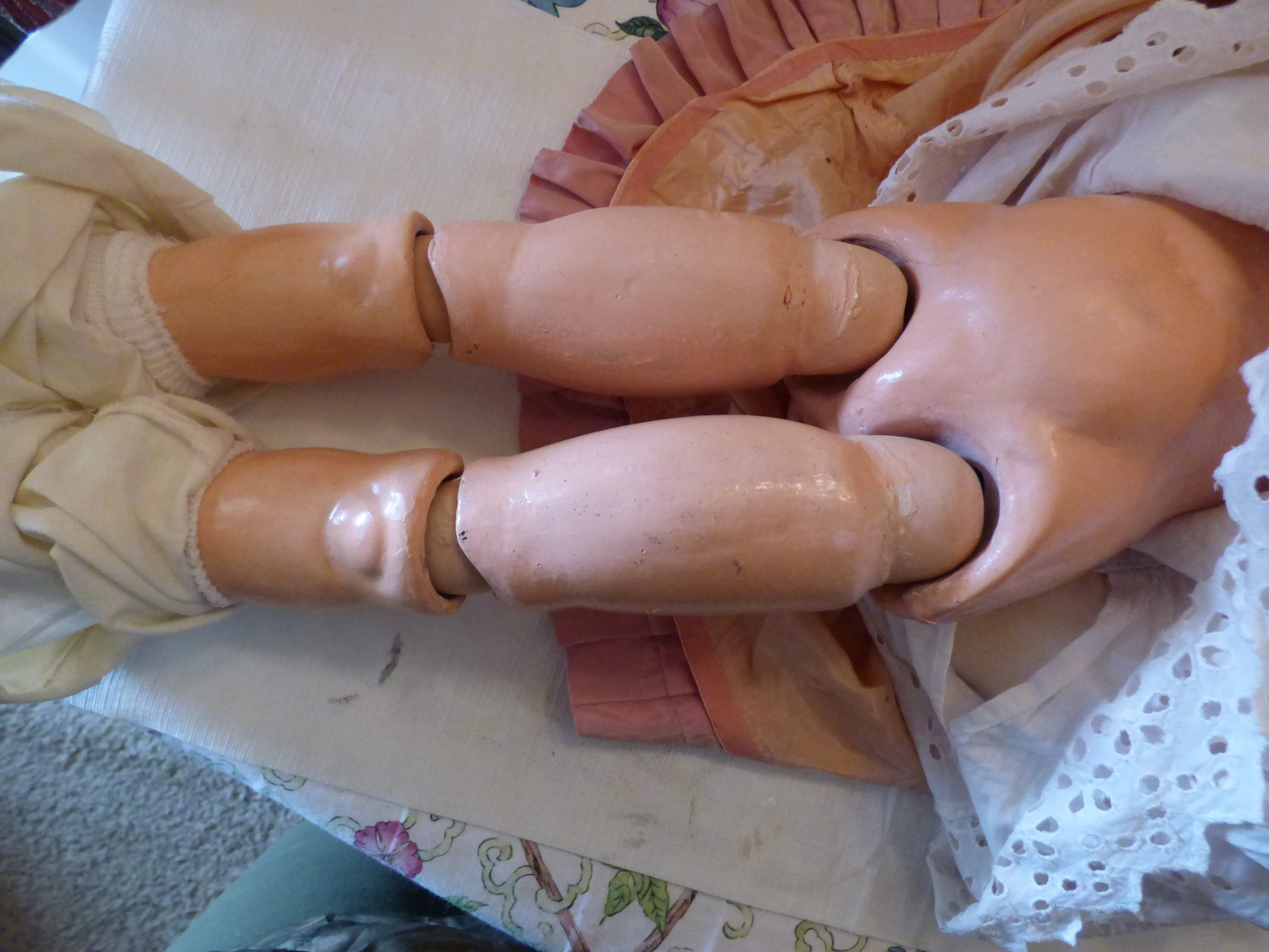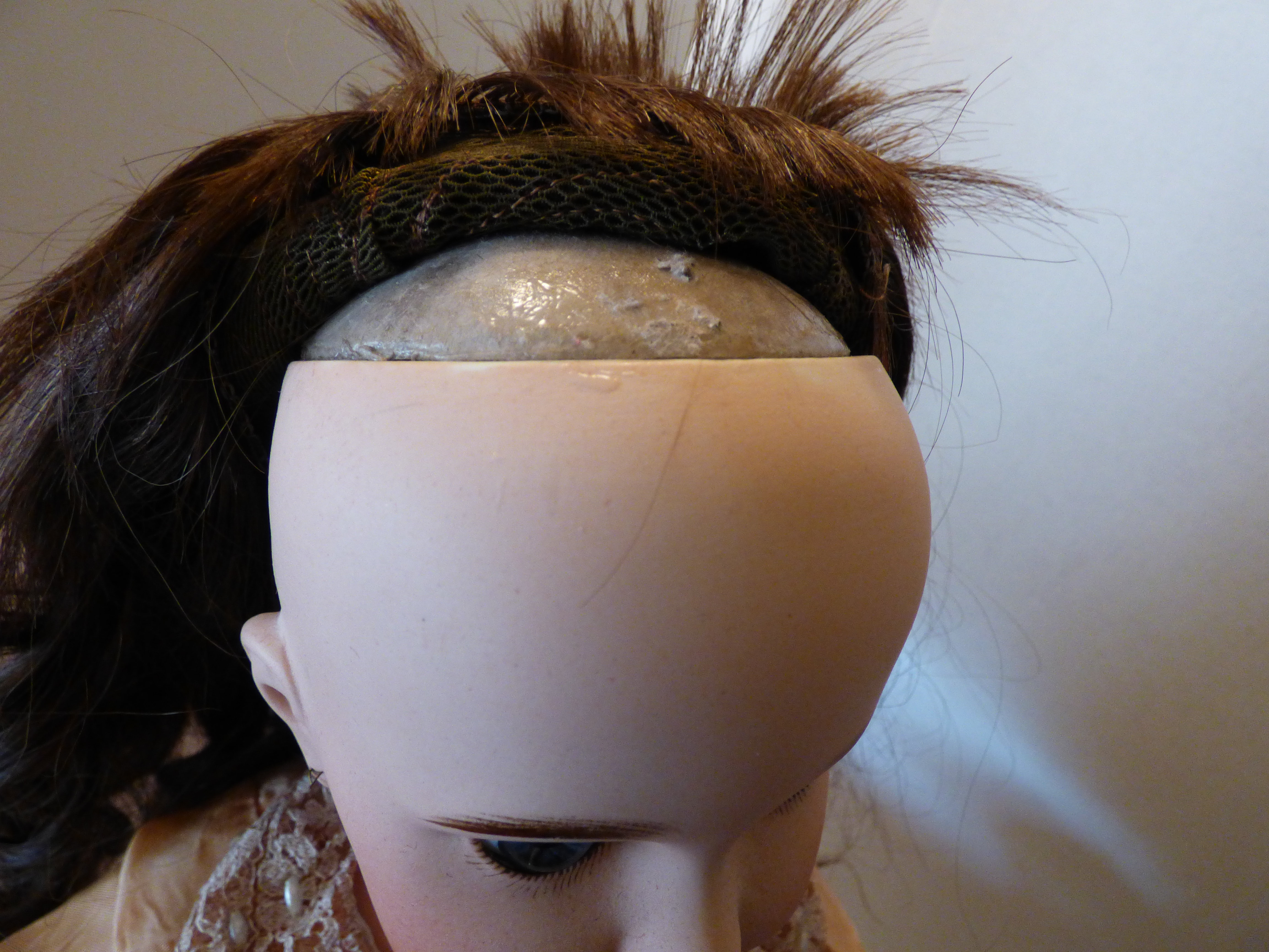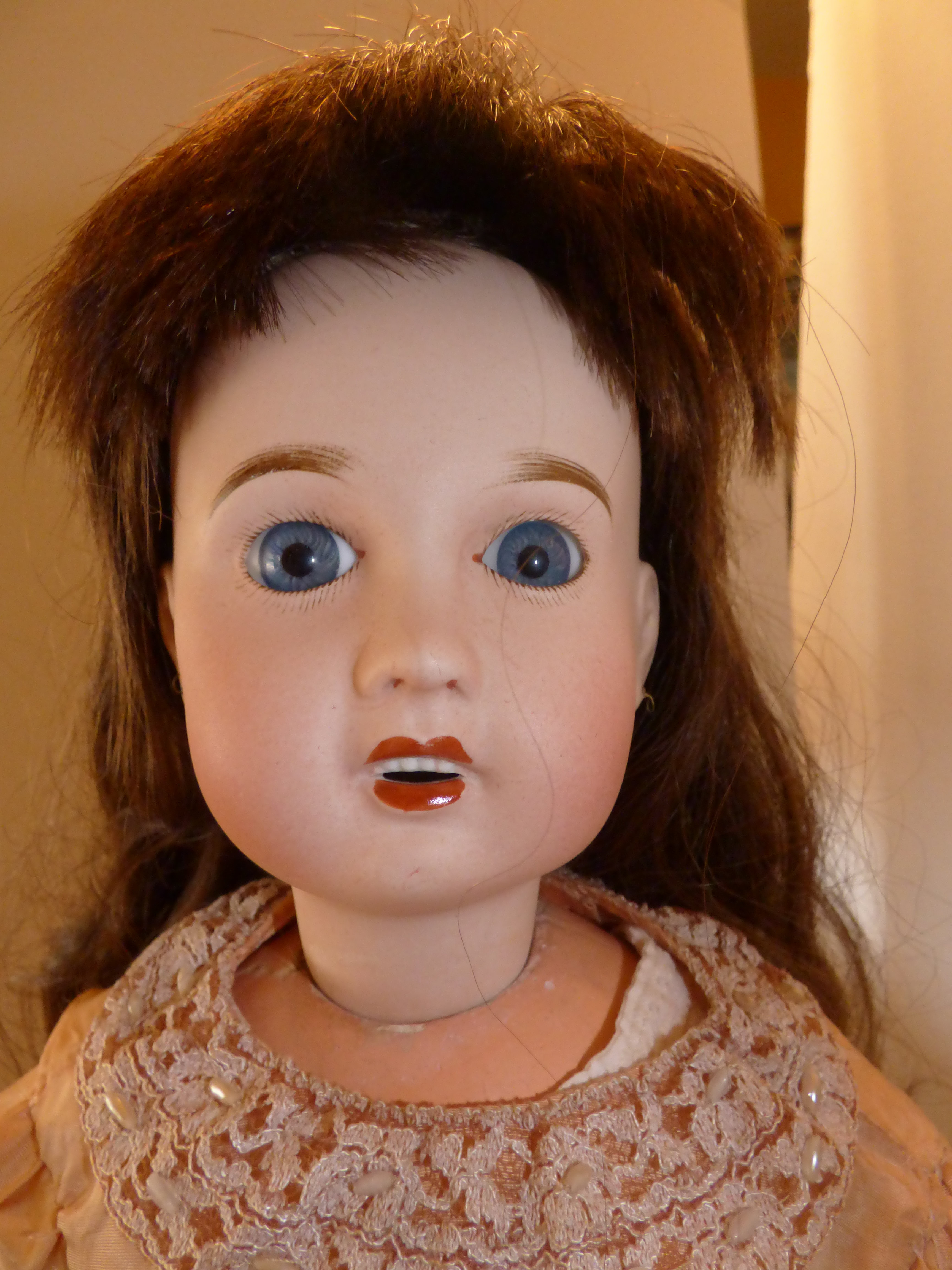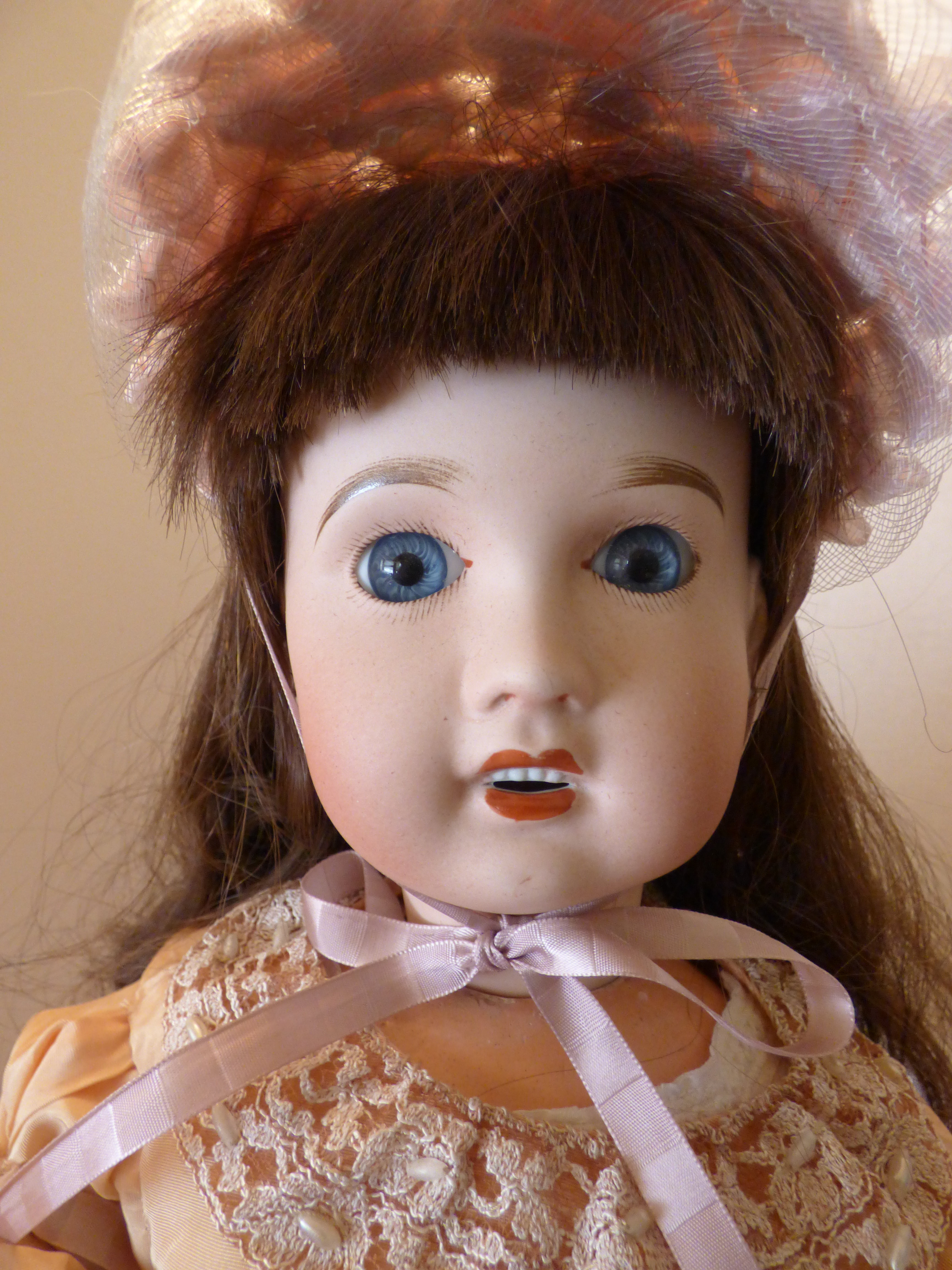 She has a dark brown shiny human hair wig with bangs. Newer cardboard pate. Complimentary straw hat that ties under chin. Set blown glass blue eyes. Pierced ears w wires left from possibly antique earrings so she needs some beads or dangly added to them or new earrings. She has an open mouth with 6 teeth as typical. Underwear includes pantaloons w lace trim hem, buttoned full slip. Beautiful mauve and salmon rayon taffeta type fabric hand made dress trimmed in lace and faux pearls. Antique pink straw hat embellished with ribbons and flowers that ties with ribbon. Human hair deep brown wig with bangs, attached to pate but pate removed to stuff head for shipping. No issues to composition.